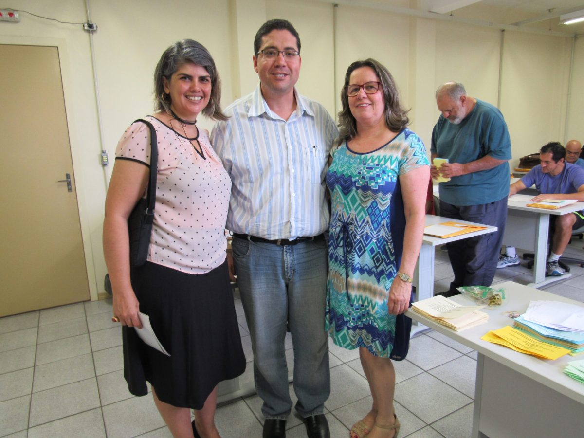 Presidente da ATENS, Diana Sampaio; Presidente da Comissão Eleitoral, Prof. Breno Augusto Diniz Pereira; e Diretora de Comunicação da ATENS, Tânia Weber.