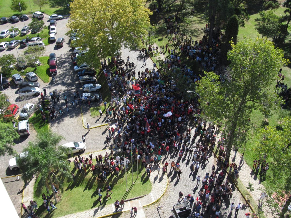 A caravana do pré-candidato Luís Inácio Lula da Silva esteve ontem em Santa Maria agitando manifestantes contra e a favor do ex-presidente. Em encontro com reitores, acompanhado de Dilma Rousseff, Lula recebeu dos dirigentes das Universidades e Institutos Federais de Ensino do Rio Grande do Sul uma carta com as reivindicações das IFES para a educação.Lula e Dilma na UFSM (8)2