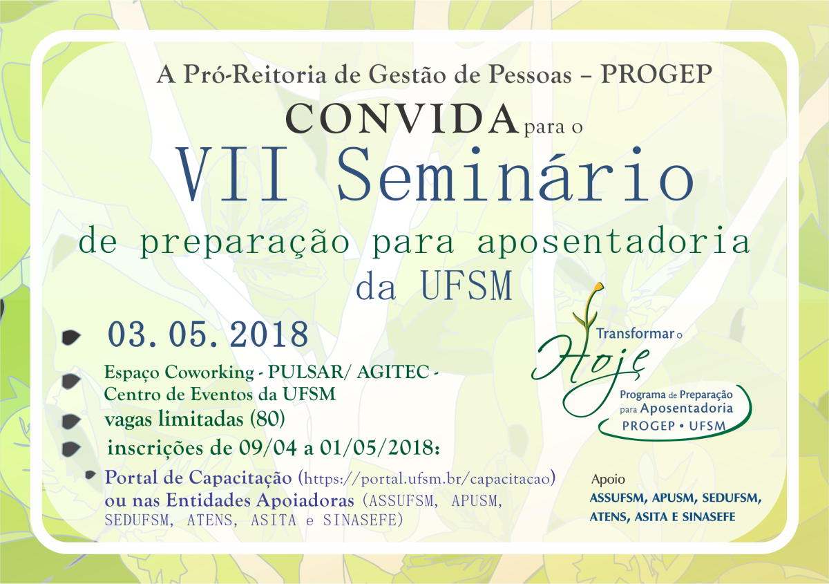 Se você está pensando em se aposentar ou é uma pessoa precavida e já está avaliando a possibilidade, então é hora de se inscrever para o VII Seminário de Preparação para a Aposentadoria. O evento ocorrerá dia 3 de maio no espaço de coworking Pulsar, no Centro de Eventos da UFSM. Serão oito horas de palestras mesas redondas e reflexões sobre assuntos que afetam a vida de quem se aposenta.