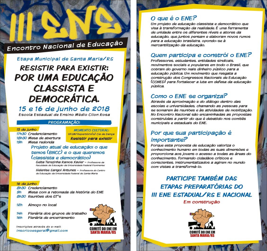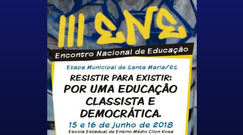 A etapa regional do III Encontro Nacional de Educação (ENE) acontece nos próximos dias 15 e 16 de junho (próximas sexta e sábado) na Escola Estadual de Nível Médio Cilon Rosa. O evento precede as etapas estadual e nacional do ENE e seleciona pautas e debates que serão levados adiantes nesses níveis. Este ano, o tema do Encontro é “Resistir para existir: por uma educação classista e democrática”.
