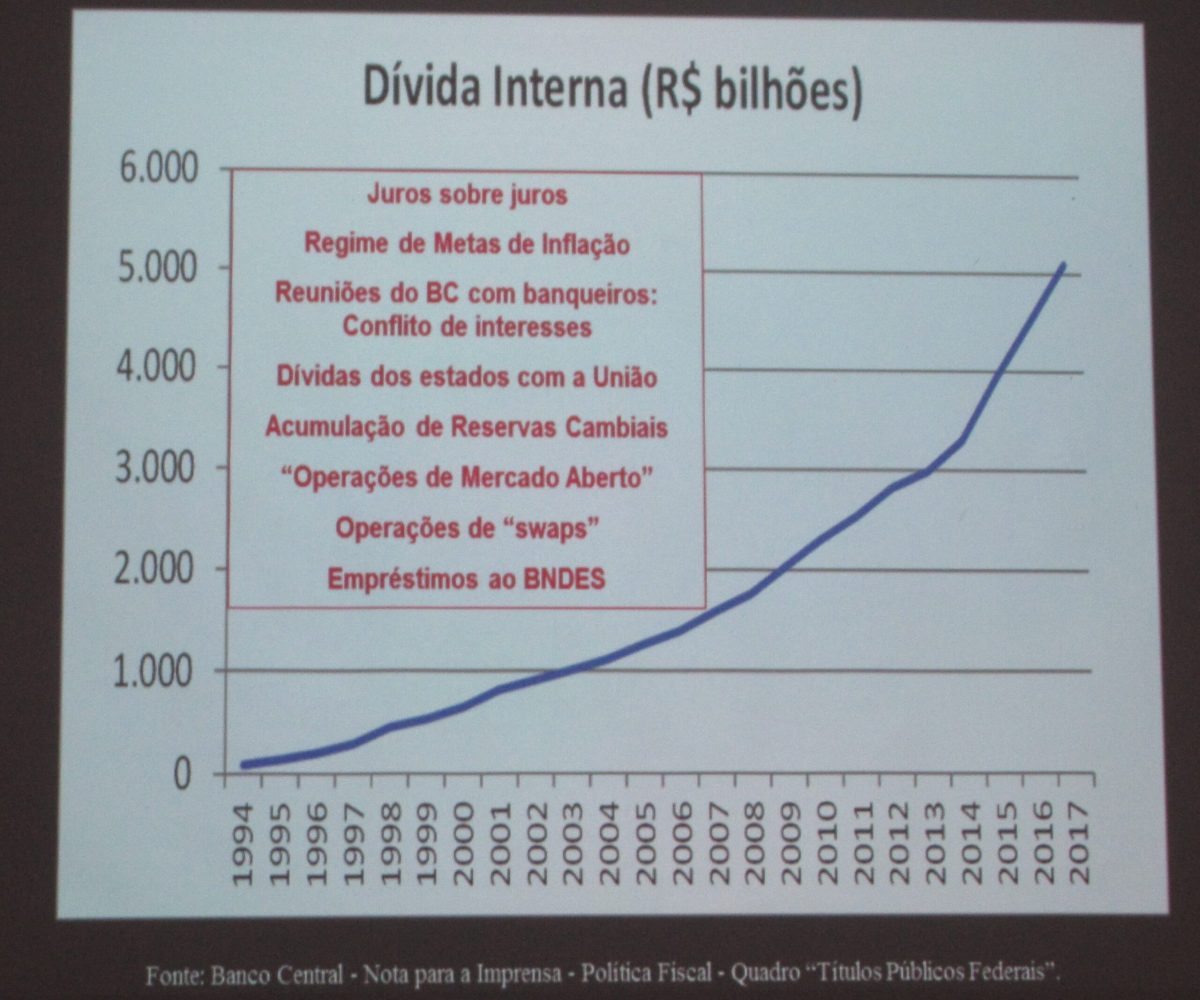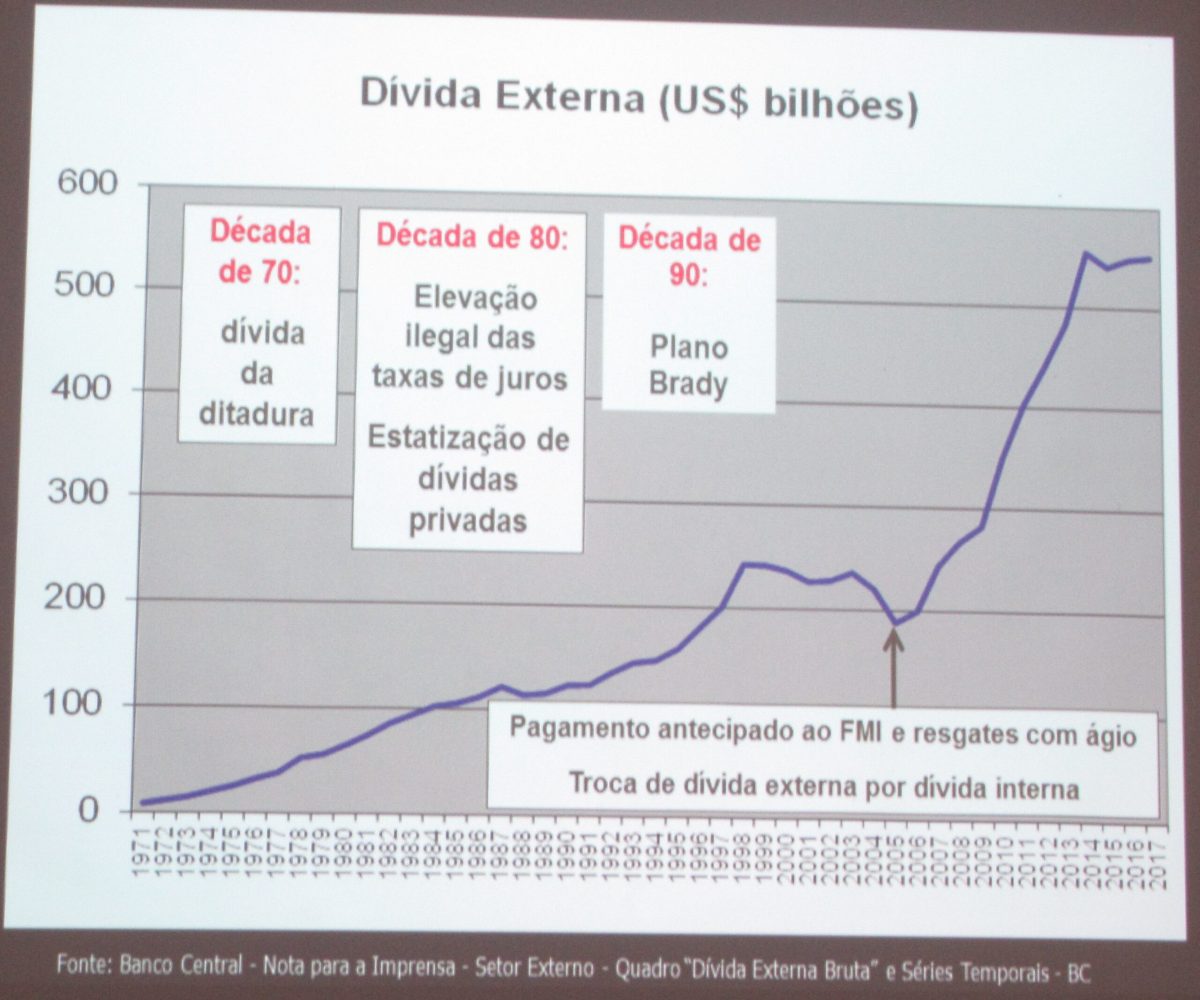 Ele explicou que a dívida foi iniciada no governo militar, quando foi pego um empréstimo no exterior contratado a juros flutuantes e em moeda estrangeira, “para obras as quais não foram encontrados os contratos”, comentou. Era a chamada dívida externa. Em seguida, o Banco Central estatizou dívidas de empresas privadas.