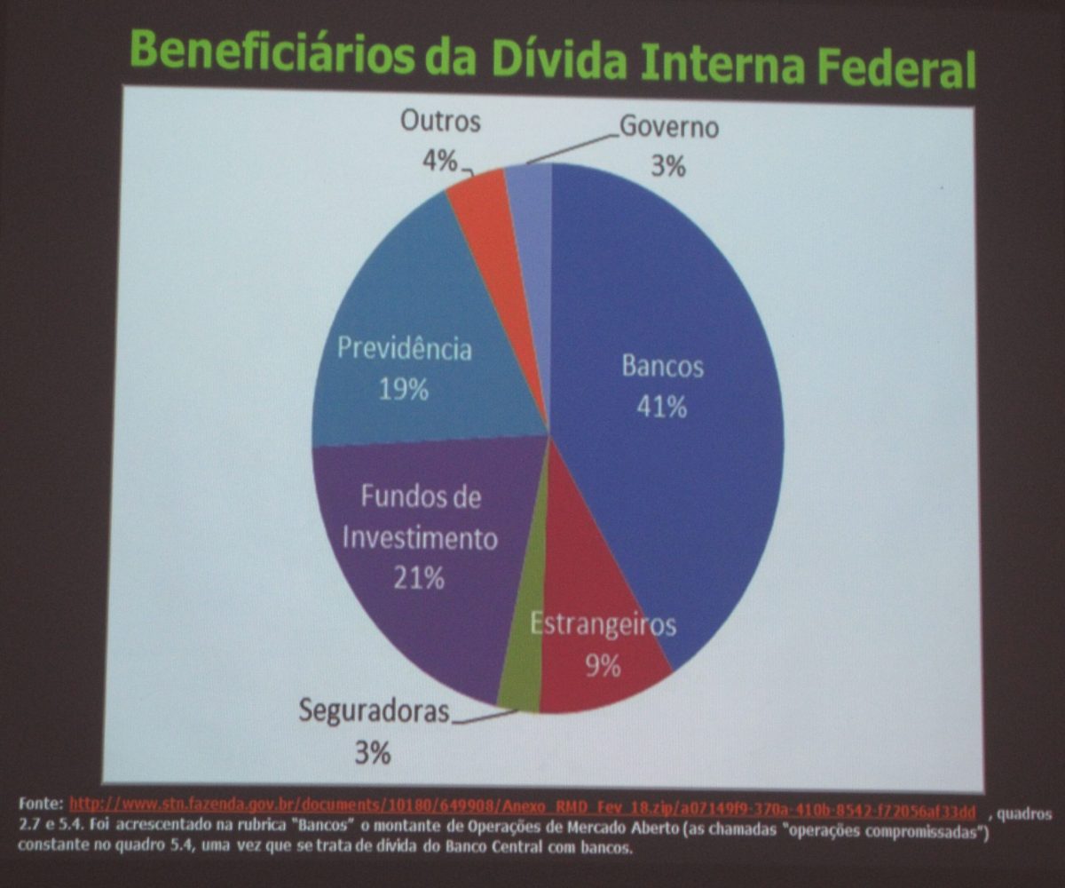IMG_5456Segundo Ávila, entre 2016 e 2017 houve alguns déficits que poderiam ter sido sanados com o fim de algumas isenções fiscais ou com uma reforma tributária. Relativamente aos juros, é comum ouvir a declaração de que se os mesmos forem reduzidos a inflação sobe. De acordo com ele, porém, “o que aumenta a inflação são os preços praticados pelo próprio governo, como luz, combustível. Aumentar os juros é só mais uma forma de enriquecer banqueiros e investidores estrangeiros. As operações compromissadas com os bancos representam 41% da dívida. 9% dela vai para estrangeiros e 21% para fundos investimentos. Ou seja, uma parte muito pequena desta dívida está nas mãos dos trabalhadores”.