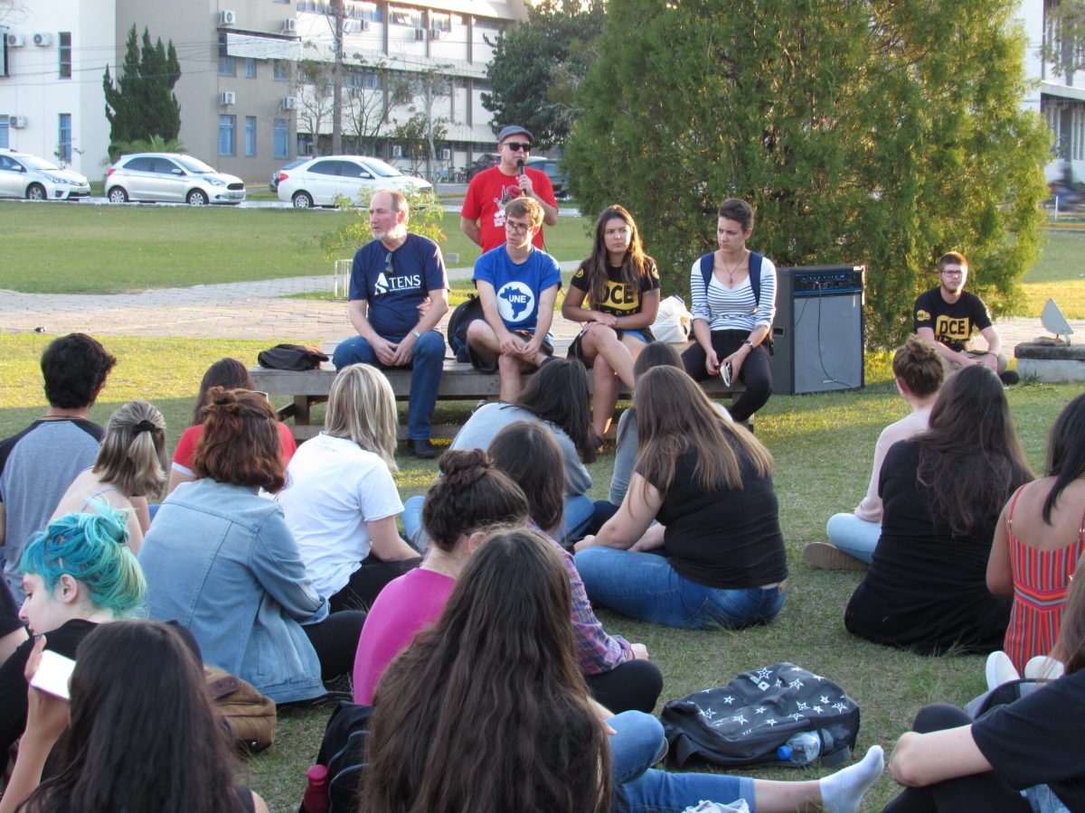 Após um breve momento de fala das entidades presentes (ATENS, DCE, Sedufsm, Assufsm e APG), representantes de diversos Diretórios Acadêmicos e também de alunos utilizaram o espaço para falas.