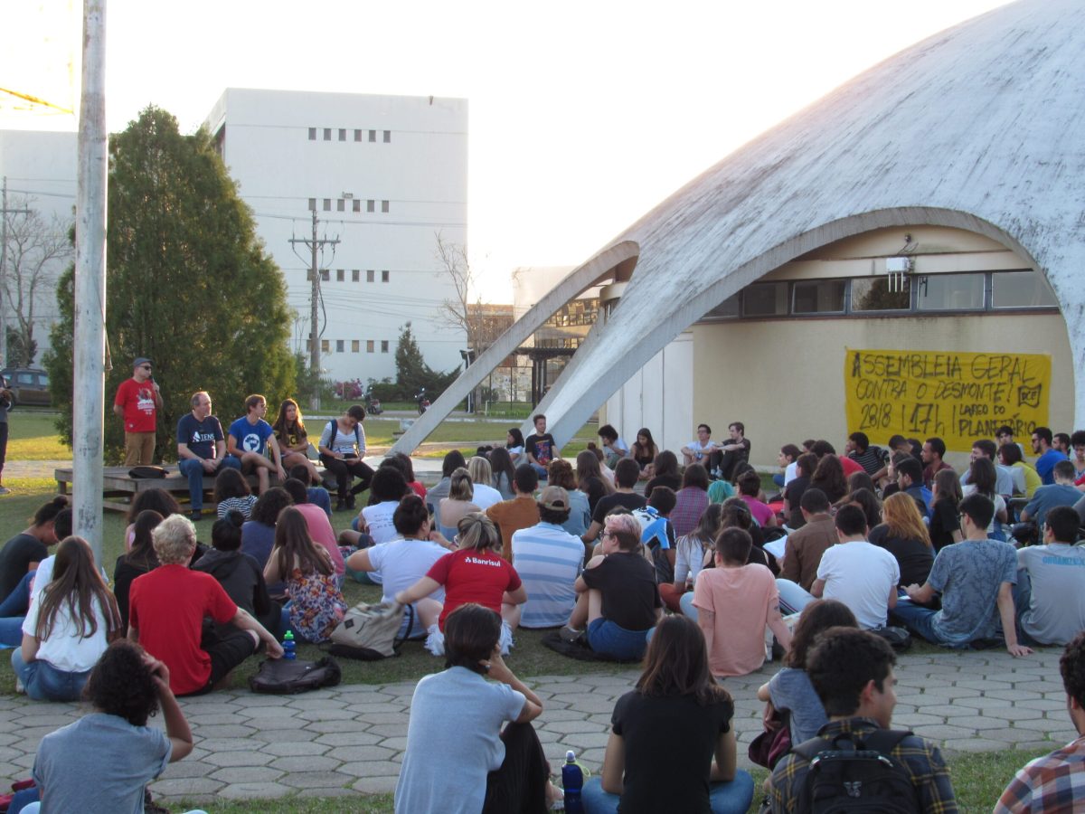 No fim da tarde do dia 28 de agosto, quarta-feira, estudantes, docentes e TAEs se reuniram no largo do planetário para deliberar sobre o Future-se e demais legislações que promovem o desmonte do ensino público. Estiveram presentes muitos estudantes, além de TAEs e professores que votaram pela rejeição total do projeto apresentado pelo governo.