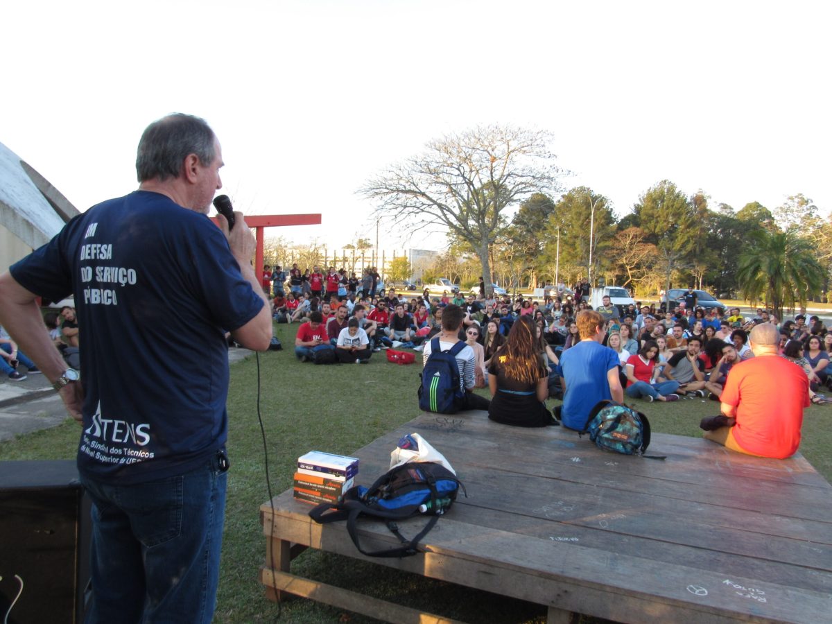 Em seu momento de fala, Clóvis Senger, presidente da ATENS/UFSM reafirmou a falácia da falta de recursos para a educação, citando as cifras de arrecadação de impostos e o valor de 40% do orçamento nacional que vai para os bancos como pagamento de uma dívida pública nunca auditada.