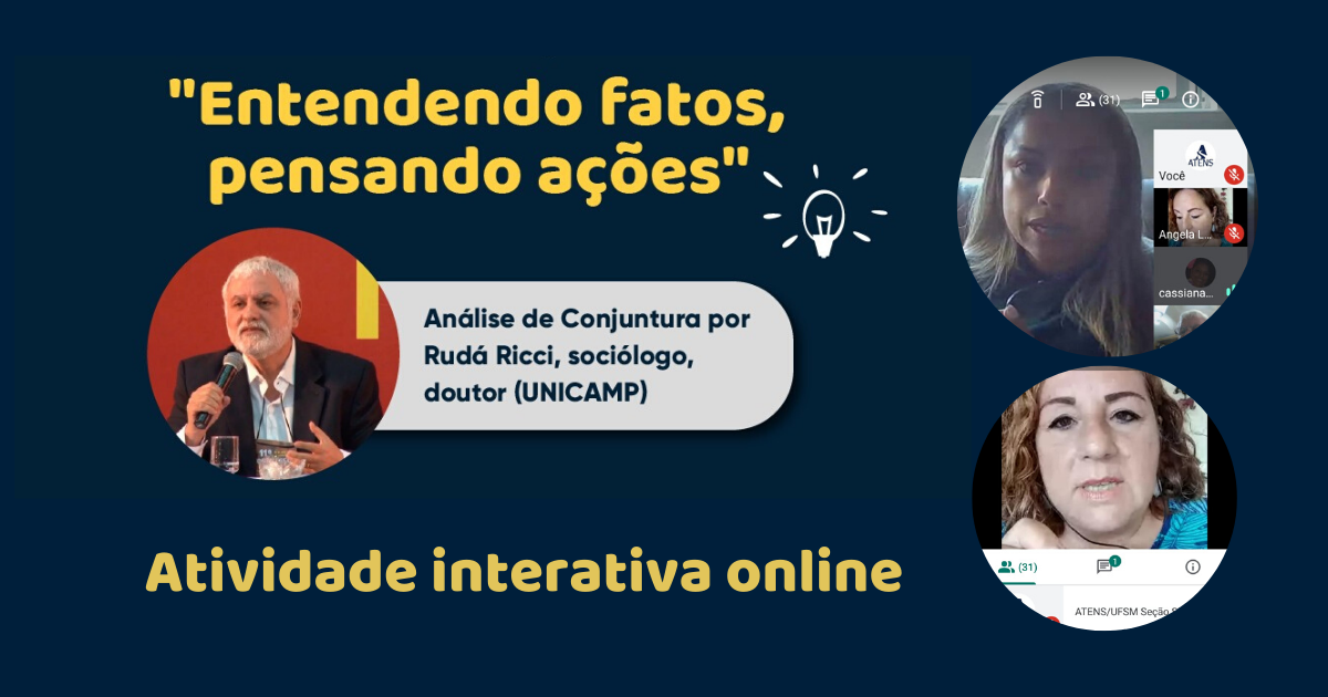Um momento para refletir sobre o cenário brasileiro, rever colegas de diferentes instituições e pensar em ações para o futuro próximo e o pós-Covid. Assim foi a atividade interativa “Entendendo fatos, pensando ações”, organizada pelo ATENS Sindicato Nacional, com apoio das seções e coordenações locais, que ocorreu online nesta quinta-feira, 7 de maio, através do aplicativo Google Meet.