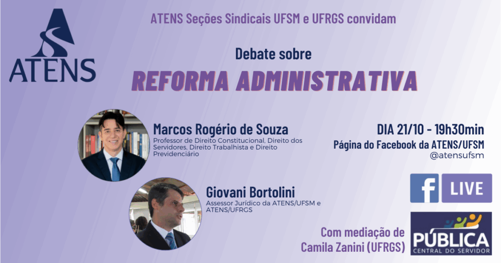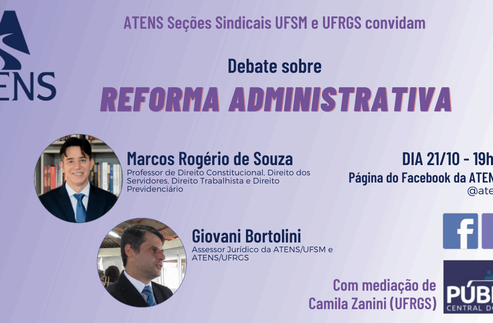 A Reforma Administrativa será tema de debate na Live da próxima quarta-feira, 21 de outubro, às 19h30min, na página do Facebook da ATENS/UFSM. O convidado é […]