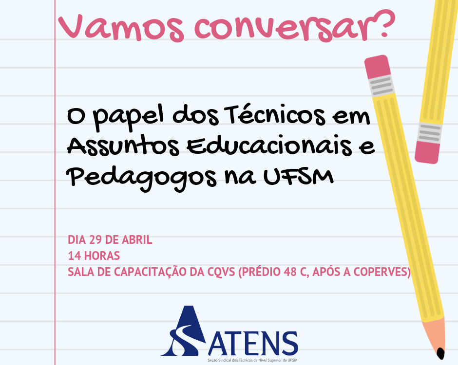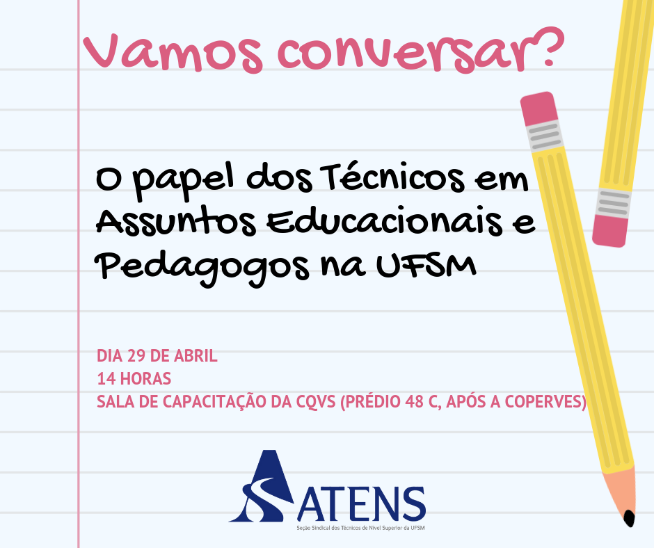 Aproveitando o ensejo do Dia da Educação, 28 de abril, a ATENS/UFSM convida Pedagogos/as e Técnicos/as em Assuntos Educacionais para debater os papéis e rumos dessas profissões […]