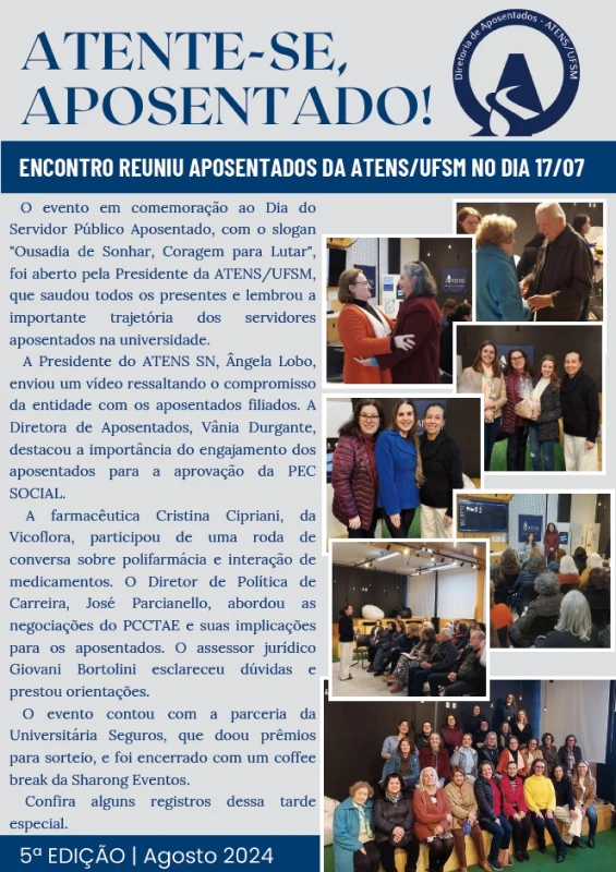 Este informativo é dedicado especialmente aos nossos membros aposentados e é publicado a cada 3 meses. Disponível em formato online e impresso, “Atente-se Aposentado” traz informações relevantes sobre eventos, benefícios e atualidades que impactam nossos aposentados. Acesse a versão online aqui e fique por dentro de tudo o que acontece!