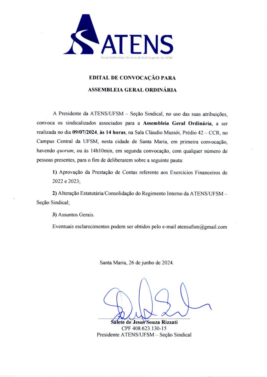 No dia 07 de julho de 2023, a Presidente da ATENS-UFSM, Salete Rizzati, e a diretora, Silvia Satler, visitaram o Lar Vila Itagiba e fizeram a […]